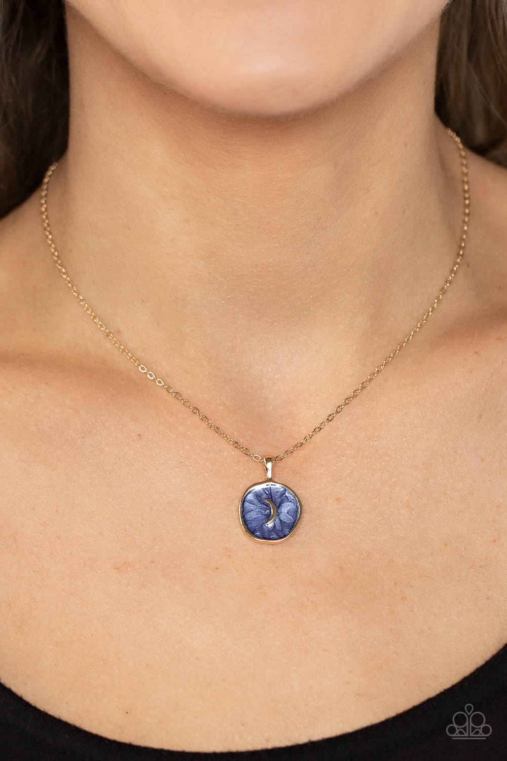 Painted in a shimmery Skydiver lacquer finish, an asymmetrical gold disc is dotted in a dainty gold moon accent as it swings from the bottom of a dainty gold chain below the collar for an enchanting finish. Features an adjustable clasp closure.