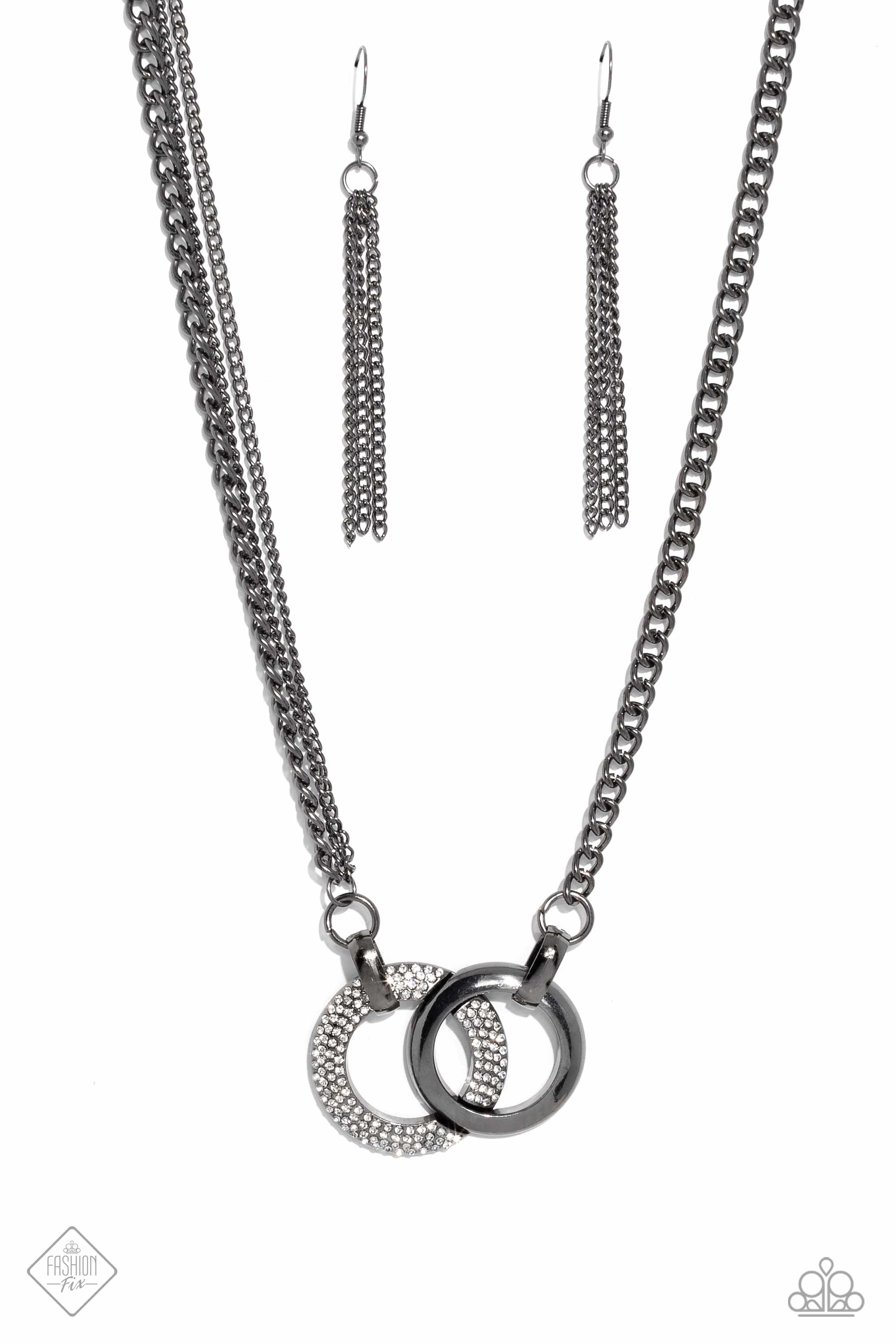 A pair of beveled gunmetal hoops interlock at the center of the collarbone, creating an eye-catching pendant. One hoop is coated in white rhinestones, while the other showcases a high-sheen finish, providing an intriguing collision of texture. The interlocking pendant is attached to a thick gunmetal chain, with a pair of daintier gunmetal chains added along one side for an asymmetrical finish. Features an adjustable clasp closure.