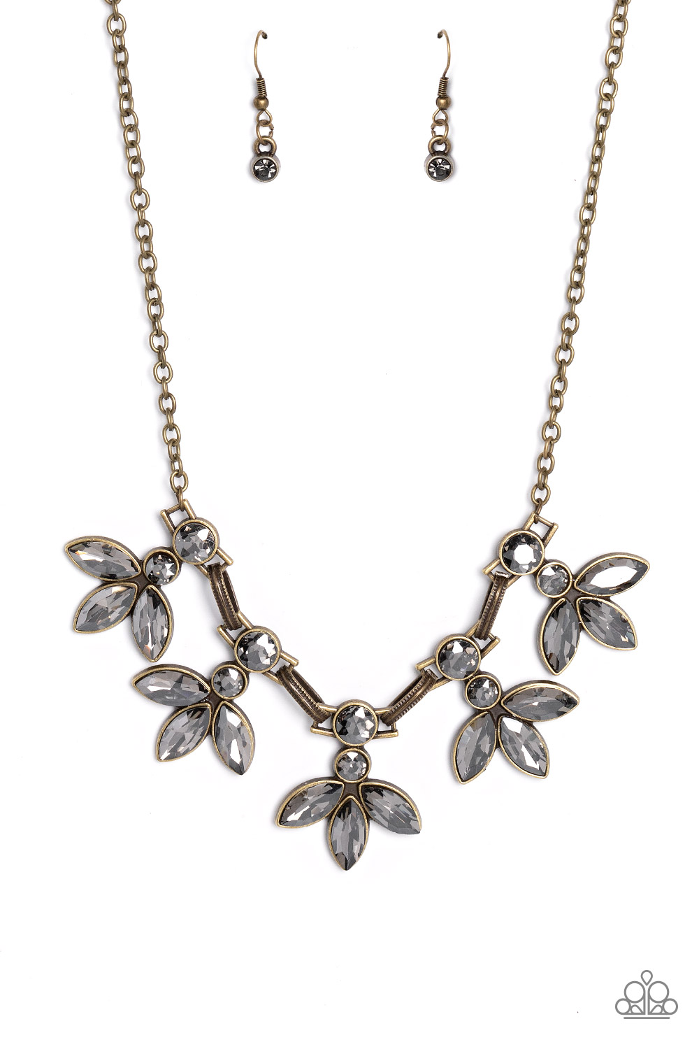 Featuring smoldering marquise style cuts, oversized smoky gems fan out from an interconnected, circular smoky rhinestone display. Separating the dauntless florals, airy brass ovals, stamped with a dot motif, create additional eye-catching sheen. Features an adjustable clasp closure.