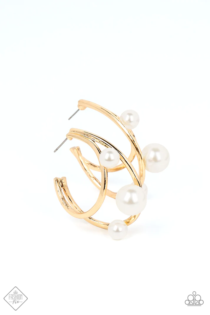Two dainty gold bars curve into dazzling double hoops, creating asymmetrical framework. Varying sizes of classic pearls dot the edges of the classic hoops, creating the illusion of floating pearl accents. Earring attaches to a standard post fitting. Hoop measures approximately 1 1/2 in diameter.