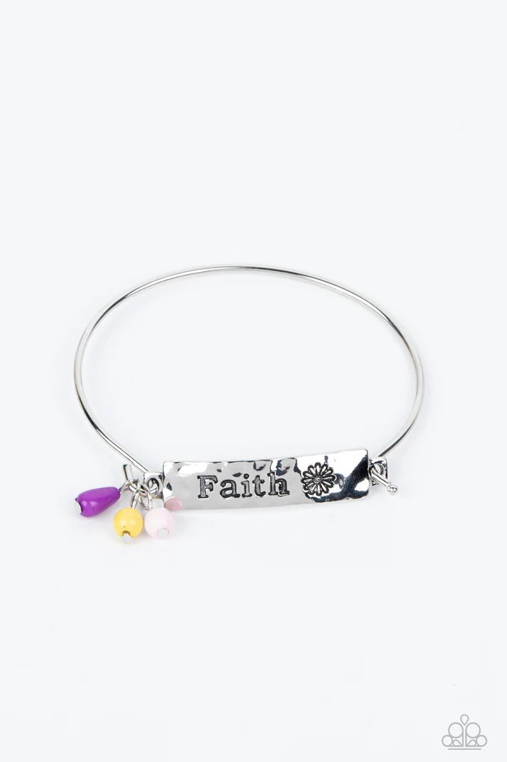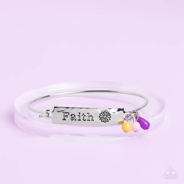 The word Faith" and a whimsical daisy silhouette are stamped across a thick hammered plate of silver. Three acrylic beads in the shades of Primrose, purple, and baby pink add a dash of color to this inspirational piece, gathering together where the plate attaches to a skinny silver cuff. Features a hook and eye closure.