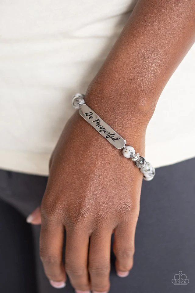 Infused with dainty silver accents, a collection of glassy black and white stone beads and a shimmery silver frame stamped in the phrase, "Be Prayerful", are threaded along a stretchy band around the wrist for an inspirational look. Color may vary. Sold as one individual bracelet.