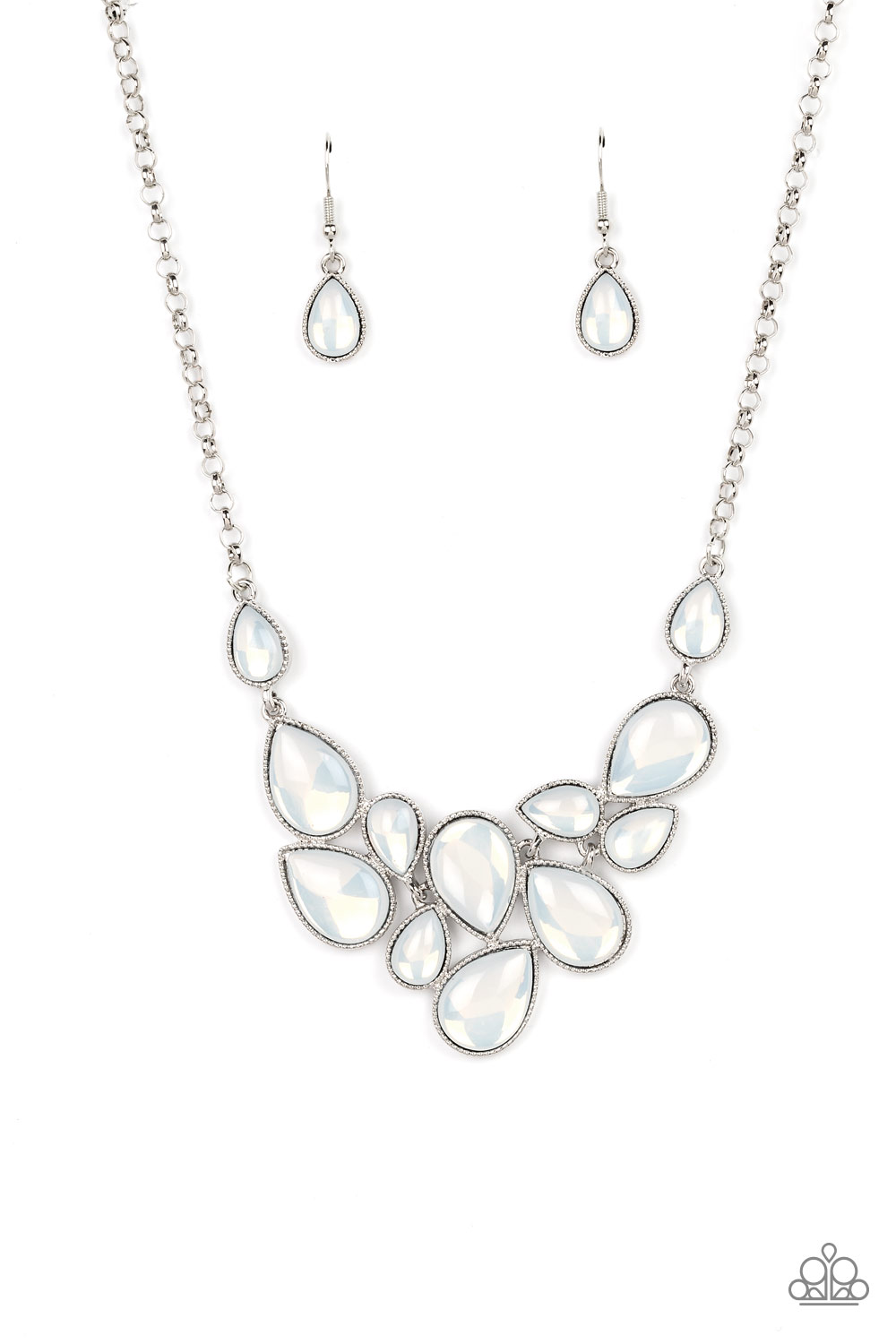 A cascade of glassy opalescent white teardrops are encased in studded silver frames, ultimately clustering below the collar to create an enchanting pop of color. Features an adjustable clasp closure.