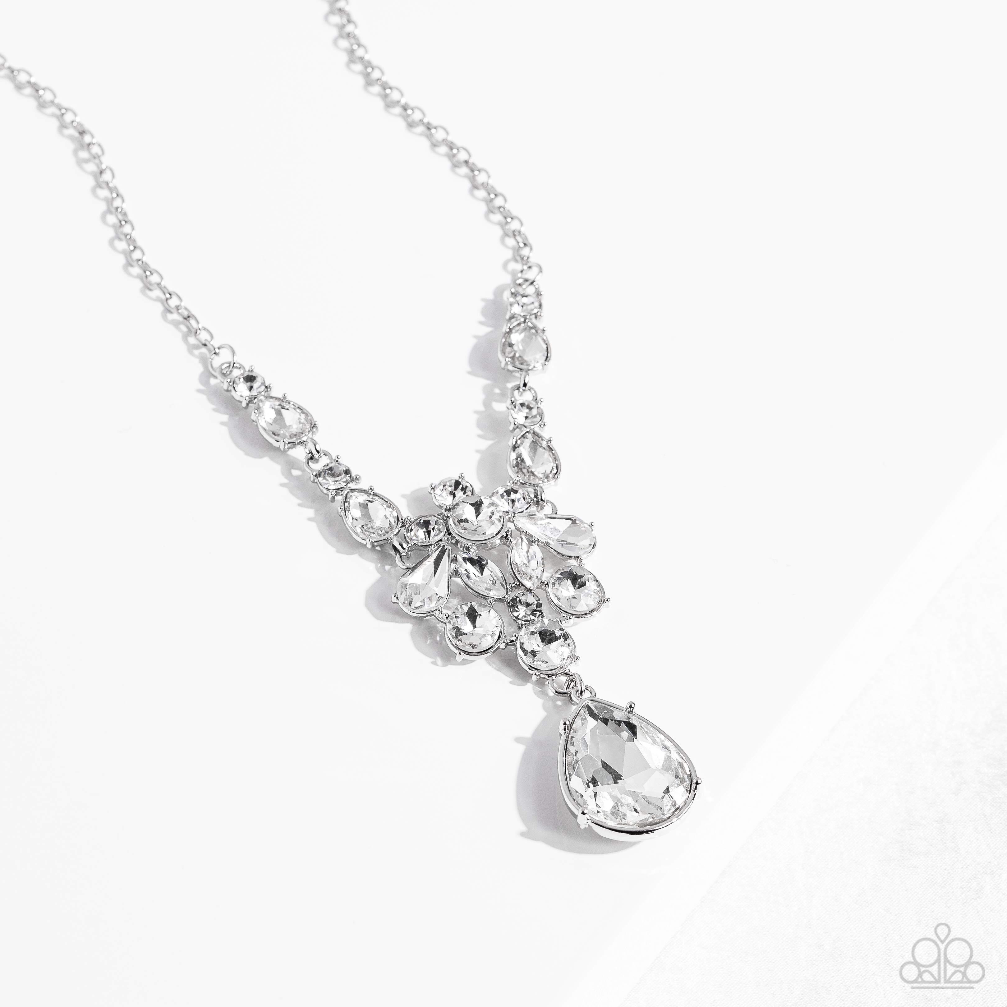 Adorned with a dainty silver chain, a twinkling collection of white, reflective teardrops, rhinestones and marquise-cut gems glitter down the chest. Hanging at the bottom of the glittery collection, an oversized teardrop gem swings for some eye-catching movement and shine. Features an adjustable clasp closure.