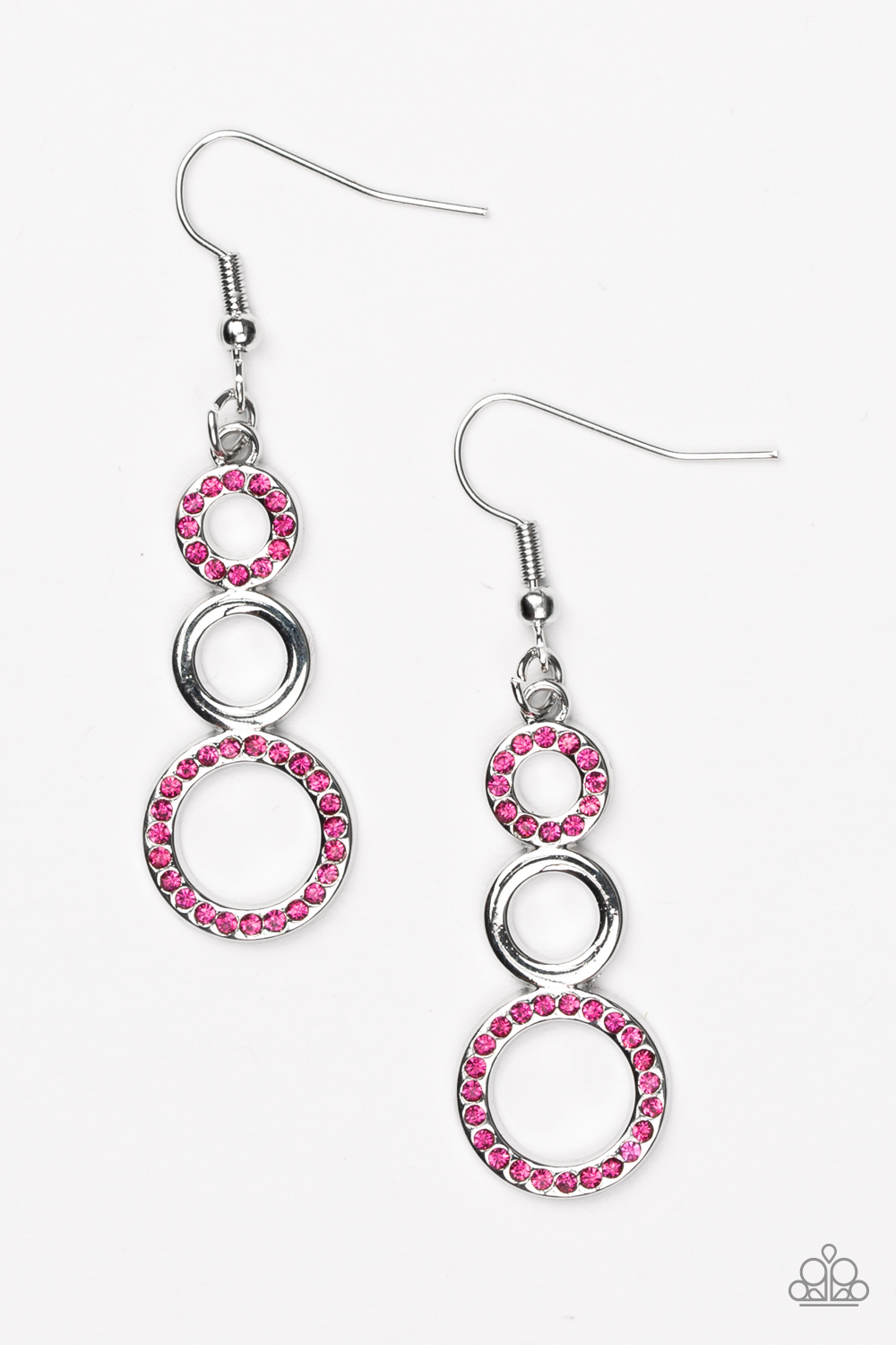 Alternating in glittery pink rhinestones, shiny silver circles gradually increase in size as they connect into a bubbly lure. Earring attaches to a standard fishhook fitting.