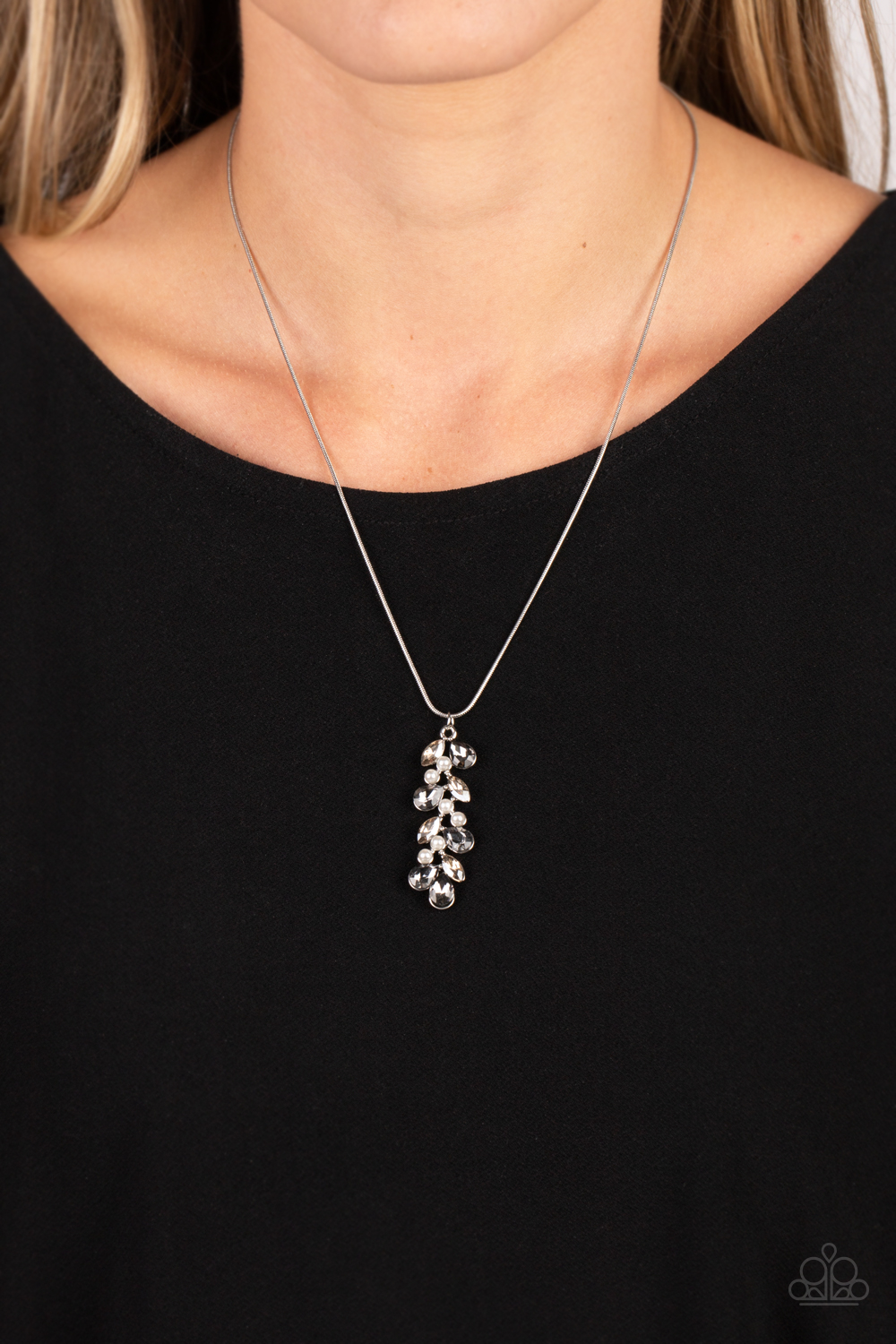 Dainty faceted jet black teardrops- and smoky marquise-cut gems climb around clusters of dainty white half-pearls, creating an elongated pendant that slides elegantly along a skinny silver snake chain. Features an adjustable clasp closure.