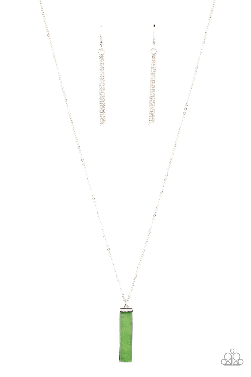 A rectangular cut jade stone is pressed into the center of a shiny silver frame at the bottom of an extended silver chain, resulting in an earthy pendant. Features an adjustable clasp closure.