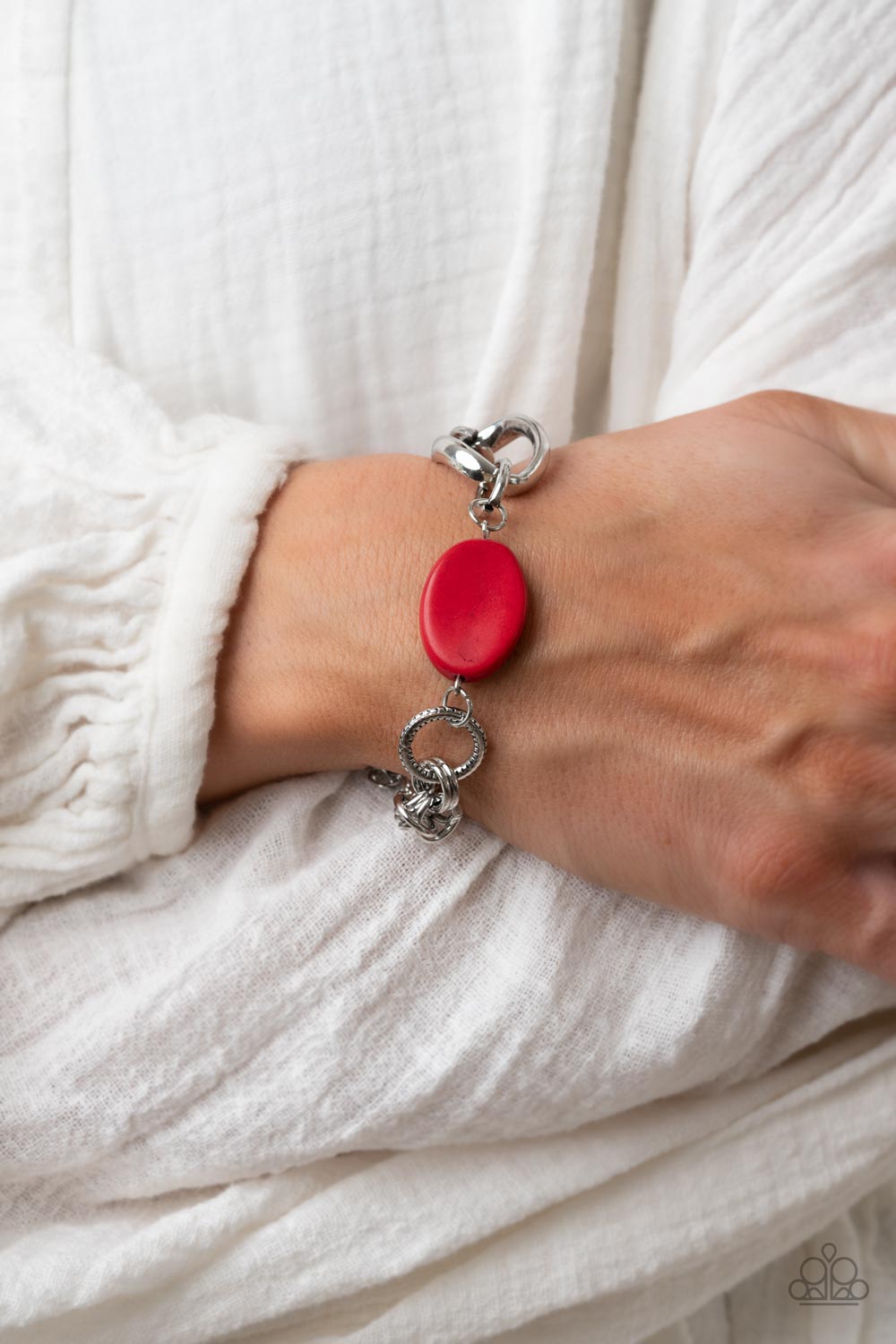 An artfully mismatched assortment of oversized silver links and geometric red stone beads delicately interlocks around the wrist for a desert inspired theme. Features an adjustable clasp closure.