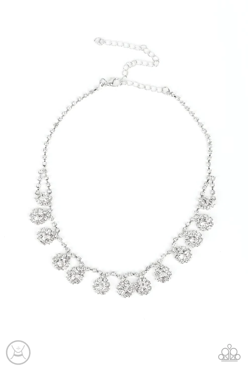 A dainty strand of glittery white rhinestones encircle solitaire white rhinestones around the neck, creating a glitzy fringe. Features an adjustable clasp closure.