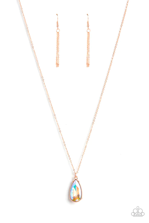 Encased in a shiny copper fitting, an iridescent teardrop gem glides along a dainty shiny copper chain below the collar for a stellar fashion. Features an adjustable clasp closure.