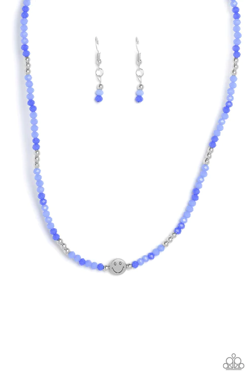 Strung along an invisible chain, a fashionable collection of beads in various shades of blue, combine with silver studs as they coalesce below the neckline. Meeting at the center of the blue design, a silver bead with a stamped smiley face finishes the design, creating a positive statement. Features an adjustable clasp closure.