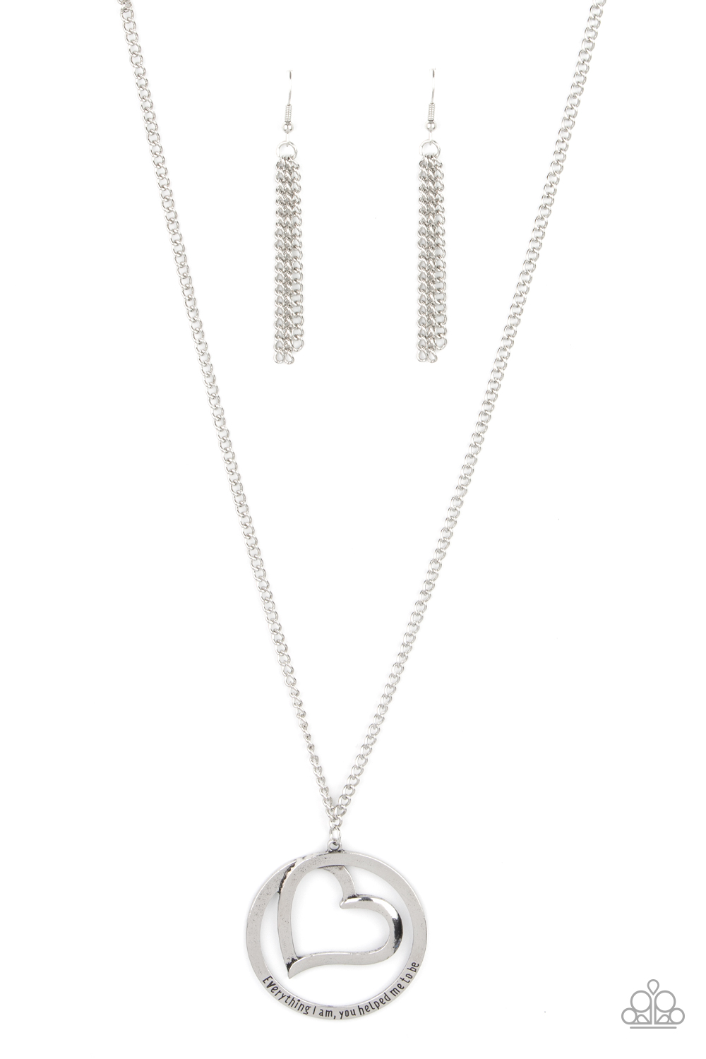 An airy silver circular frame wraps around to enclose a silver heart. The frame is inscribed with the words, "Everything I am, you helped me to be," for a positively lovely pendant swinging from a lengthened silver chain. Features an adjustable clasp closure.
