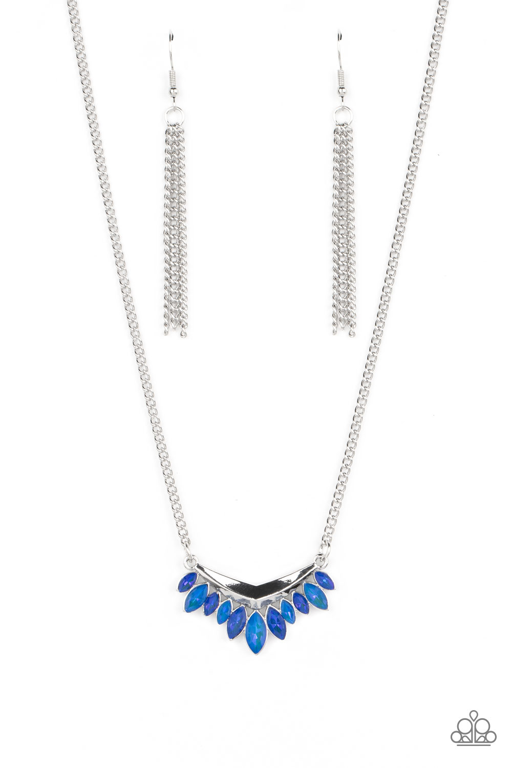 Hanging from a classic silver chain, varying shades of blue marquise-cut gems, encased in sleek silver frames, line the edge of a daring V-shaped bar for a boisterous fringe. Features an adjustable clasp closure.