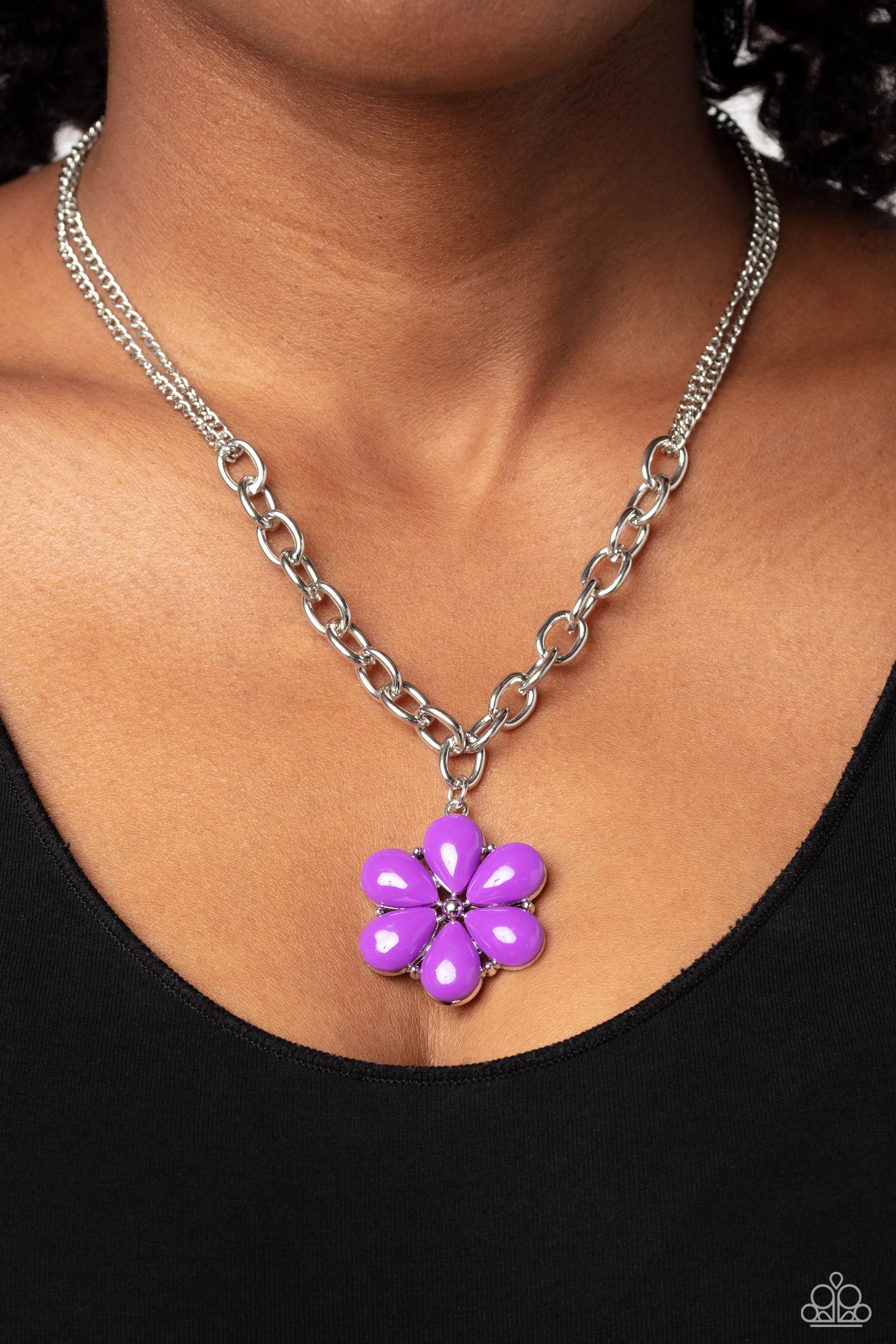 Purple acrylic petals bloom from and around silver-studded accents and a studded center. The colorful display hangs from a collection of thick silver oval links that interlock and hang below a double-layered silver chain for a bright, floral finish.