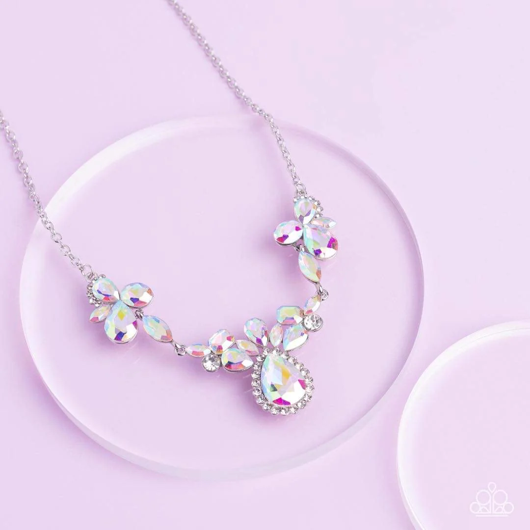 Sold as one individual Paparazzi necklace. Includes one pair of matching colorful earrings.