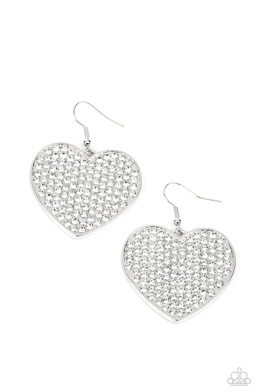 A shiny, oversized silver heart is covered in tiny white rhinestones, emitting radiant shimmer as it swings from the ear. Earring attaches to a standard fishhook fitting.