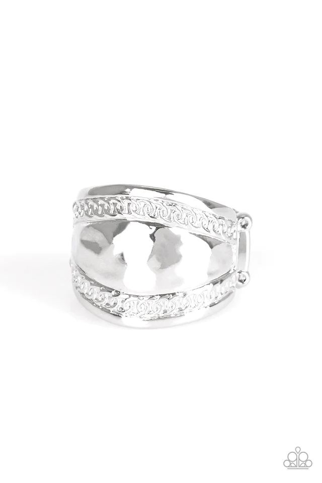 Ribbons of circular texture are embossed along the borders of a hammered silver band for an edgy look. Features a stretchy band for a flexible fit.