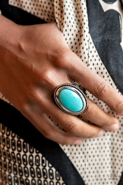 silver frame that is dotted with an oversized oval turquoise stone, creating an authentically earthy centerpiece atop the finger. Features a stretchy band for a flexible fit.