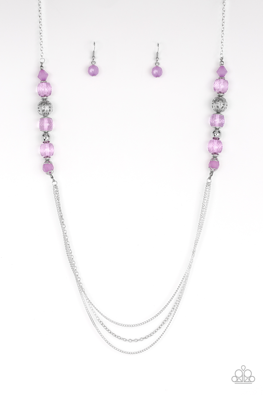 A collection of ornate silver accents and glassy and opaque purple crystal-like beads give way to shimmery silver layers for a refined look. Features an adjustable clasp closure.