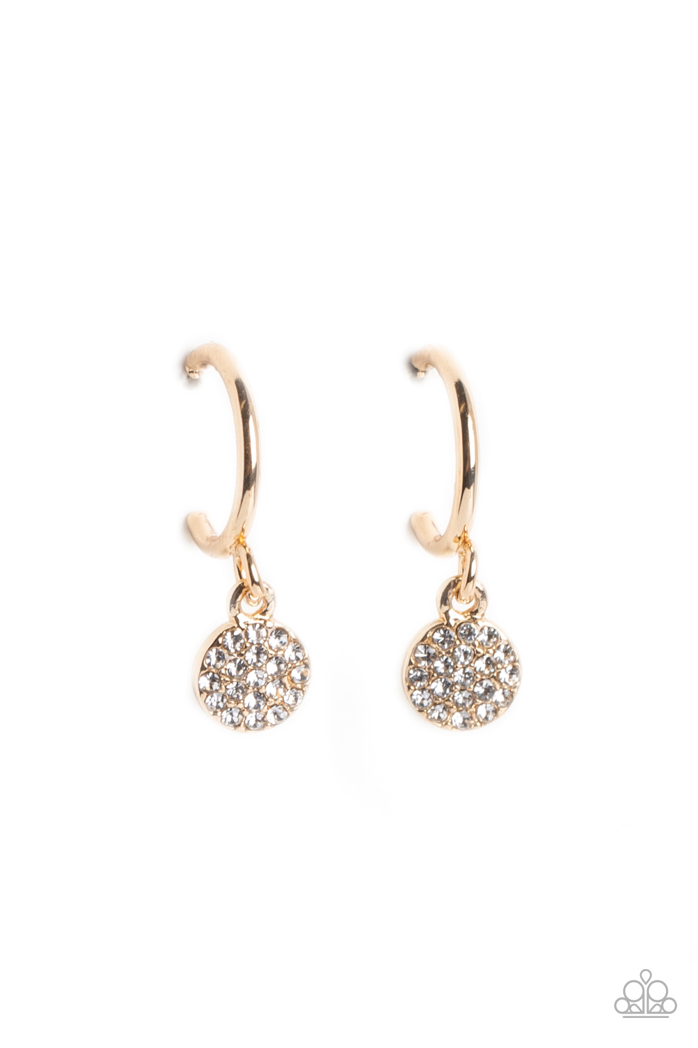 Swinging from a glistening gold hoop, a dainty gold disc, embossed with white rhinestones glimmers, adding a subtle shimmer around the ear. Earring attaches to a standard post fitting. Hoop measures approximately 1/2" in diameter.