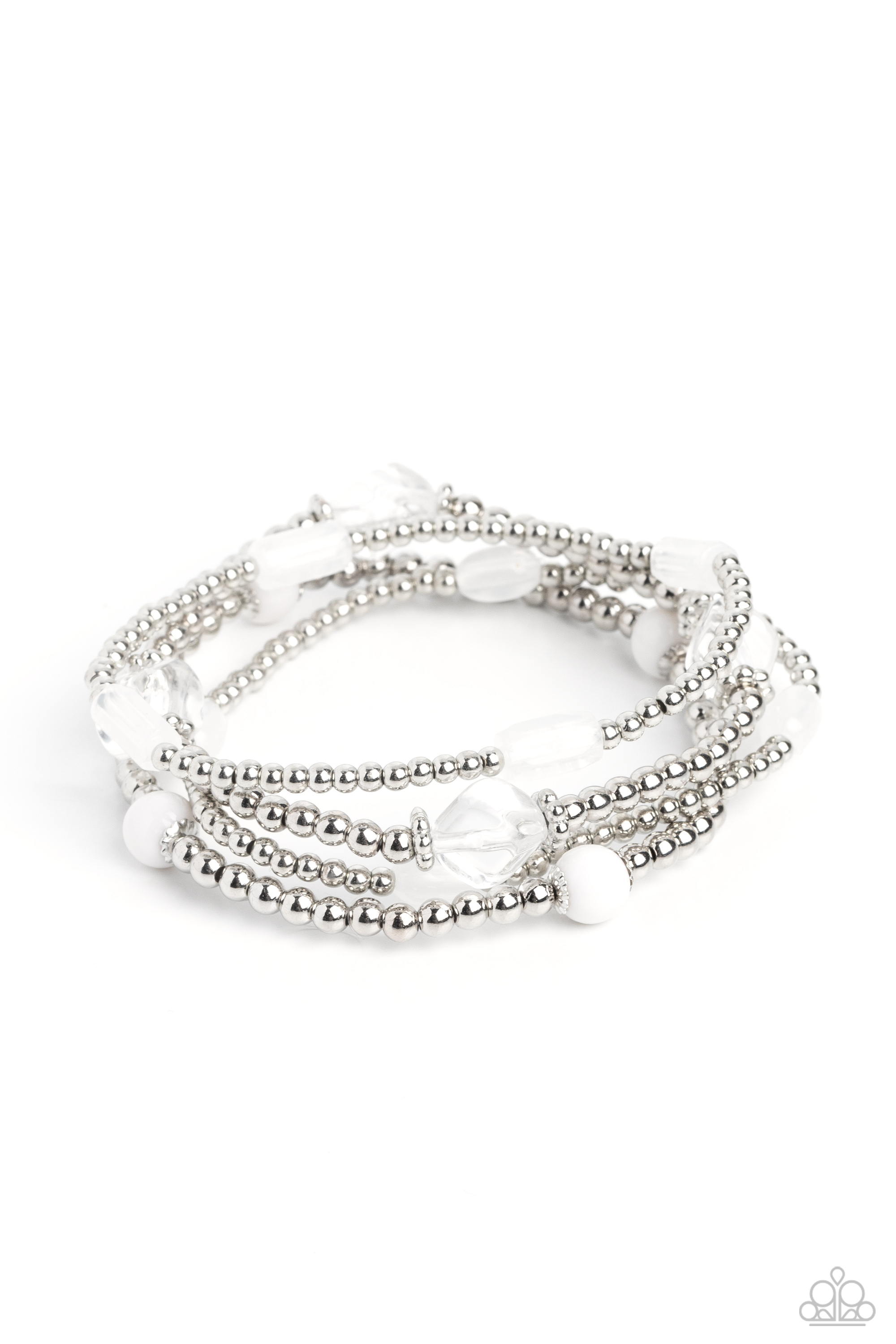 Dainty silver beads, silver accents, and white acrylics in milky, transparent, and solid shades wrap around the wrist on elastic stretchy bands for a colorfully geometric display.