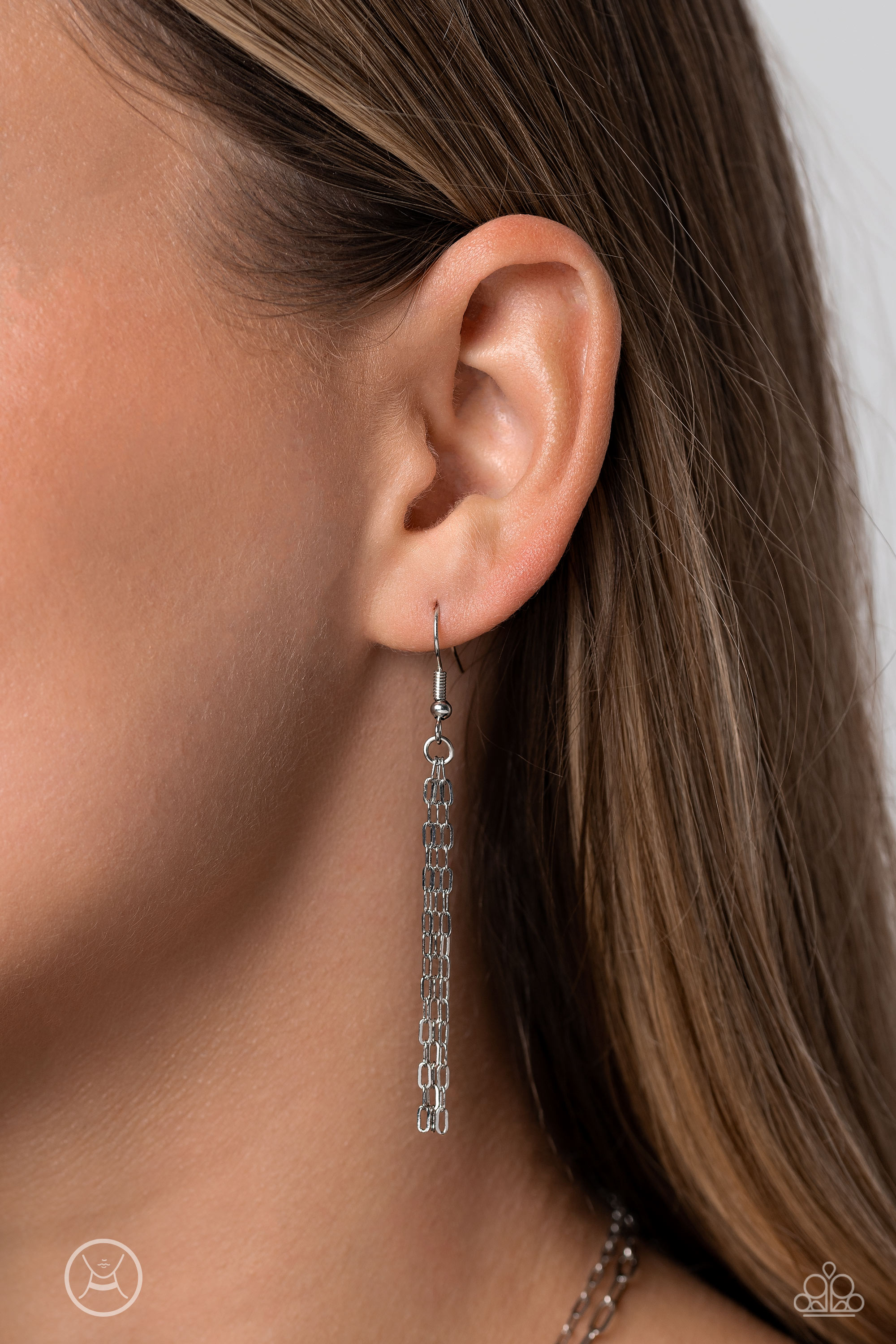 A dainty duo of silver paperclip chains coalesces down the neckline, with one chain slightly bigger than the other to emphasize its high-sheen, monochromatic simplicity. Features an adjustable clasp closure.