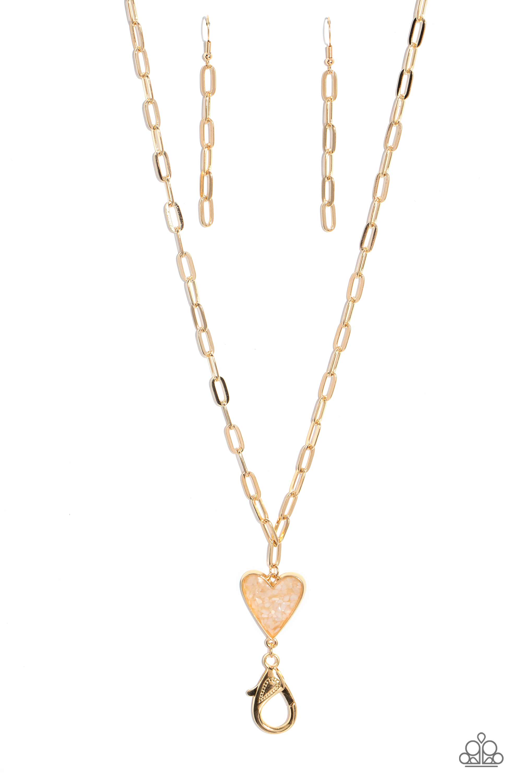 Shiny gold oval links coalesce down the neck, meeting a heart pendant, wrapped in a shiny gold frame. Encased within the heart, white flecks of shell haphazardly pattern into a kaleidoscope of color below the neckline for a flirty finish. A lobster clasp hangs from the bottom of the design to allow a name badge or other item to be attached. Features an adjustable clasp closure.