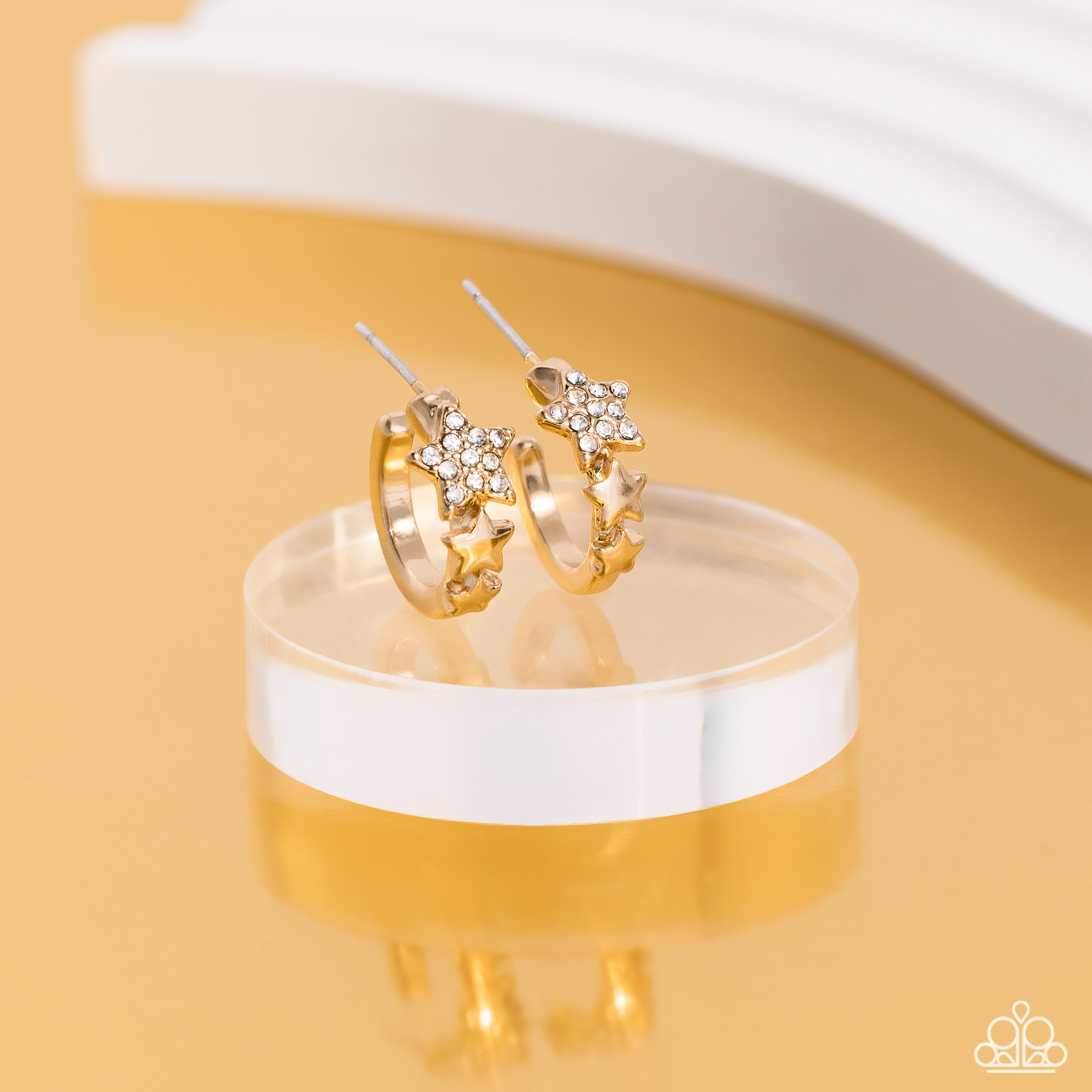 A shiny gold bar curls around the ear into a dainty hoop. Three gold stars gradually increase in size as they climb the curve of the hoop, with the biggest star emblazoned with white crystal-like rhinestones across its surface. Earring attaches to a standard post fitting. Hoop measures approximately 1/2" in diameter.