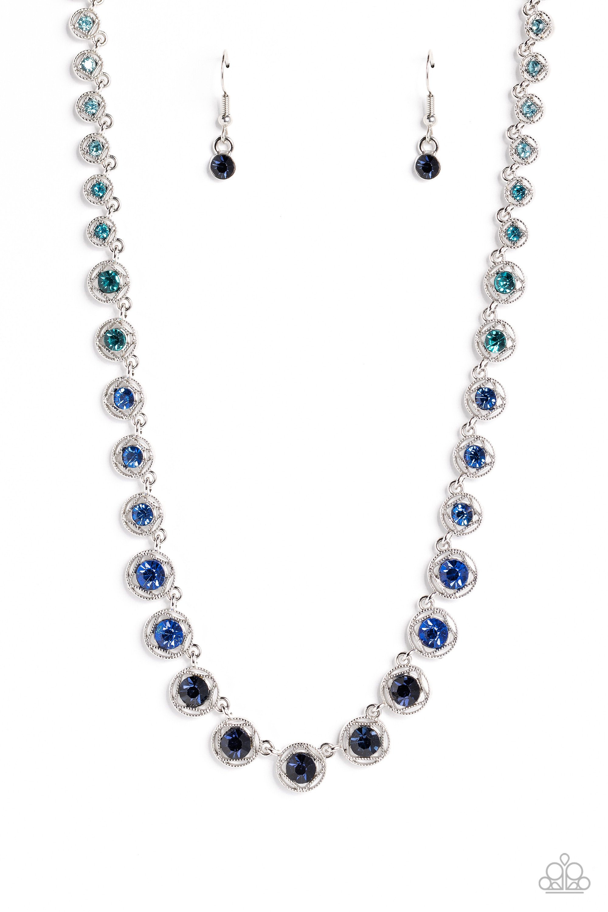 Spanning around the entirety of the neckline, a refined collection of rhinestones in shades of blue are pressed into airy, studded, silver square frames, tilted on their sides for a three-dimensional shimmer. The frames and rhinestones gradually increase in size as they fall down the neckline, accentuating their colorful sparkle. Features an adjustable clasp closure.
