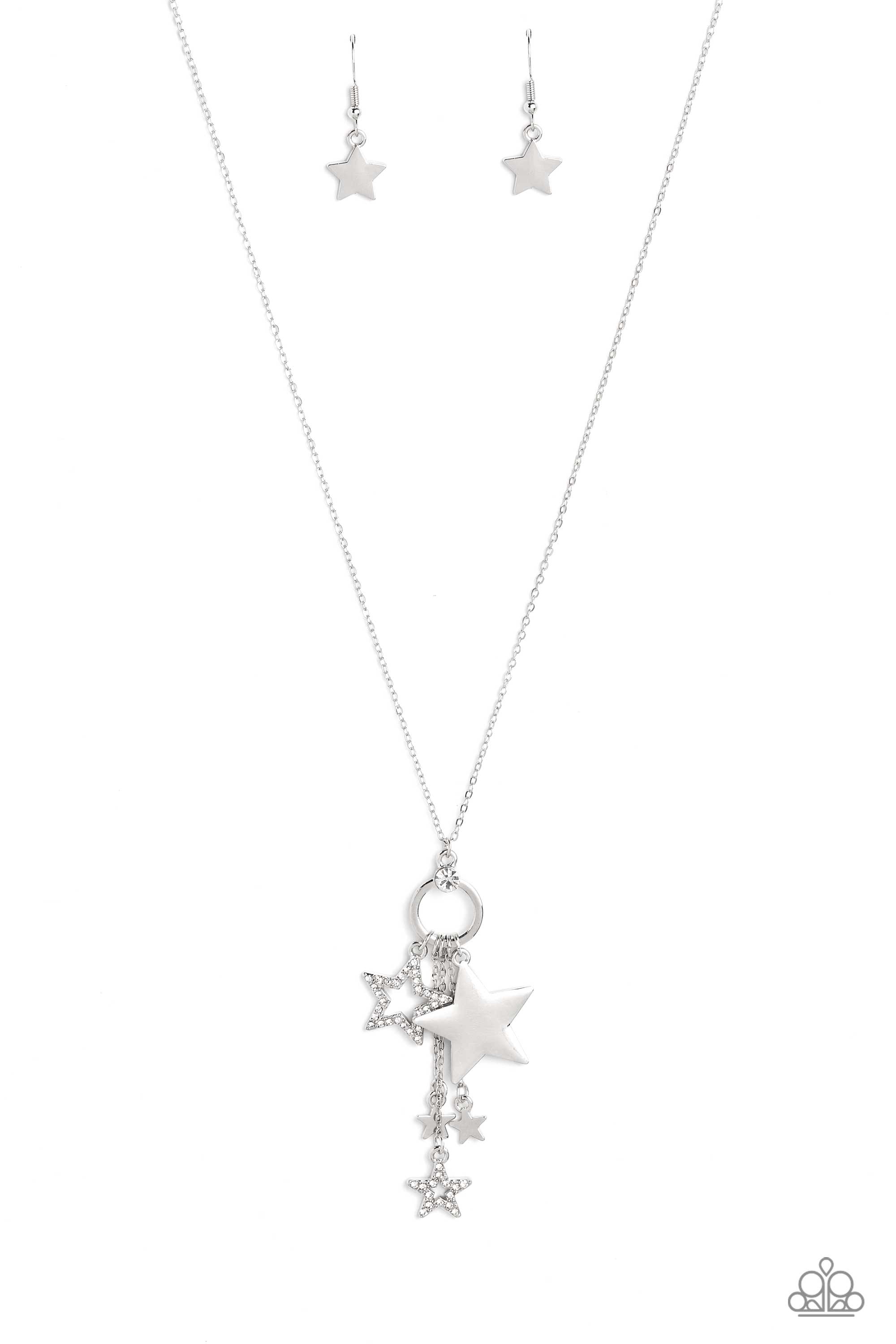 Hanging from an airy silver hoop, a collection of silver stars in varying sizes shimmer down the neck in this all-American piece. Airy, white rhinestone-studded stars mix with the other stars to add some extra shimmer. A dainty white rhinestone rests atop the silver ring for an additional pop of color. Features an adjustable clasp closure.