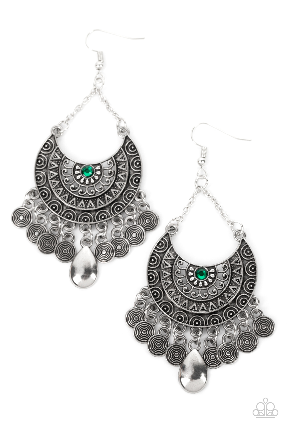 Dotted with a solitaire green rhinestone, row after row of tribal inspired patterns stack into a decorative silver crescent. Embossed with spiraling textures, dainty silver discs and a single silver teardrop frame swings from the bottom of the ornate frame for a noise-making finish. Earring attaches to a standard fishhook fitting.