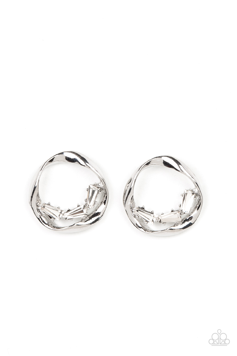 Featuring trapezoidal cuts, a trio of white rhinestones sparkles along the bottom of a warped silver hoop for a timeless twist. Earring attaches to a standard post fitting.