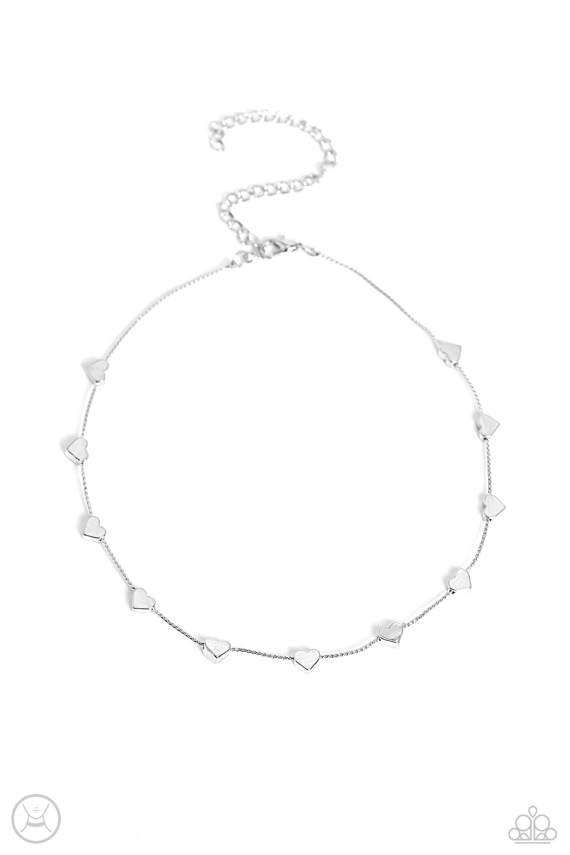 Infused along a dainty silver cascade chain, sleek silver hearts coalesce around the neckline for a subtly romantic finish. Features an adjustable clasp closure.