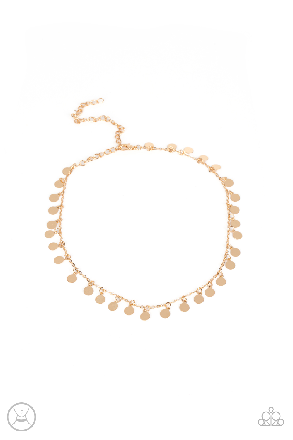Tiny gold discs dance along a classic gold chain, creating an understated choker necklace. The reflective surfaces of the discs shimmer brightly, as the light catches their high sheen finish to exaggerate their intensity. Features an adjustable clasp closure.