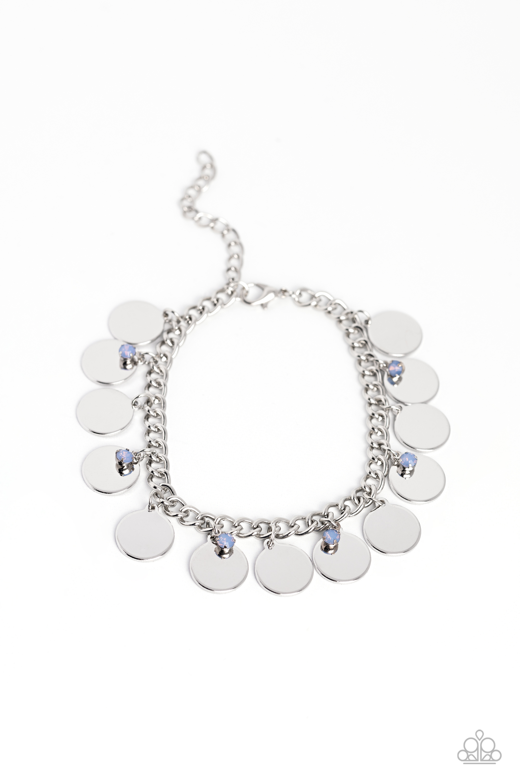 Dainty, opalescent blue beads dance along a silver chain alongside high-sheen silver discs for an understated girly design. Features an adjustable clasp closure.