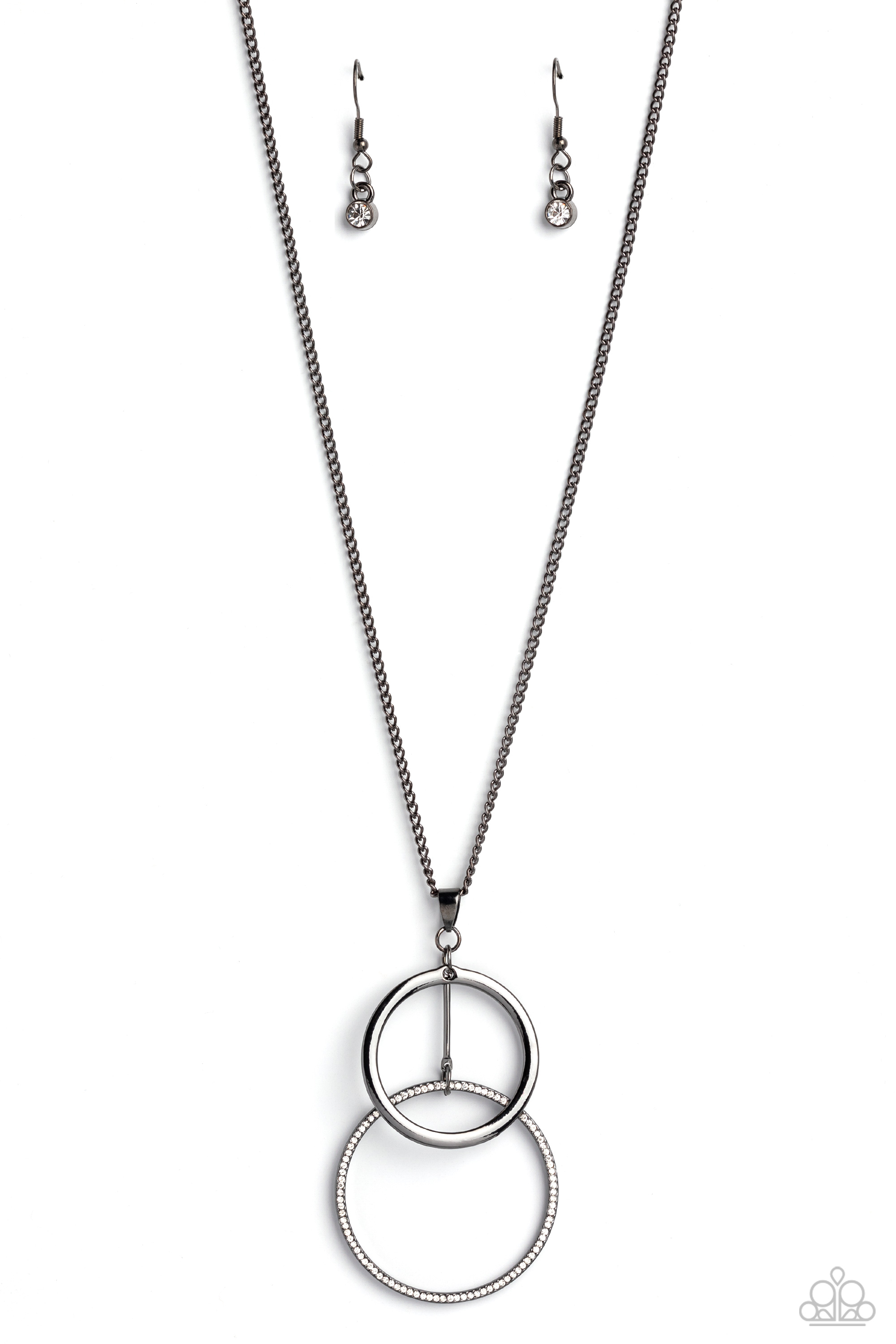 Falling from a classic gunmetal chain, a high-sheen gunmetal ring is overlapped by a bigger gunmetal ring embossed with dainty white rhinestones for a simple, scintillating statement. Features an adjustable clasp closure.