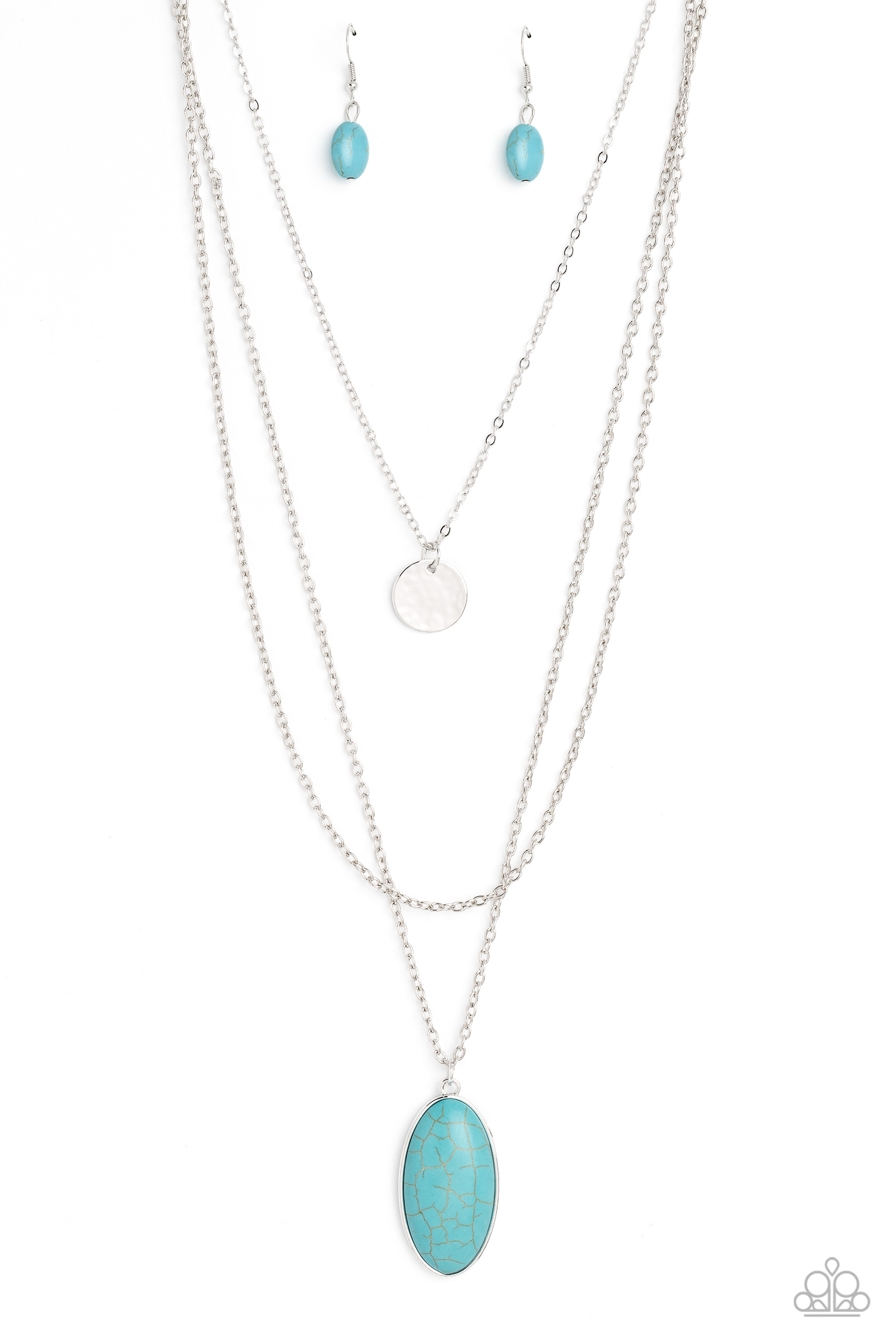 An elongated oval turquoise stone, pressed into a silver frame, swings from the bottom of an elongated silver chain. Layers of silver chain and a hammered silver disc add charisma as they combine to fall below the collar for a timeless earthy finish. Features an adjustable clasp closure. As the stone elements in this piece are natural, some color variation is normal.