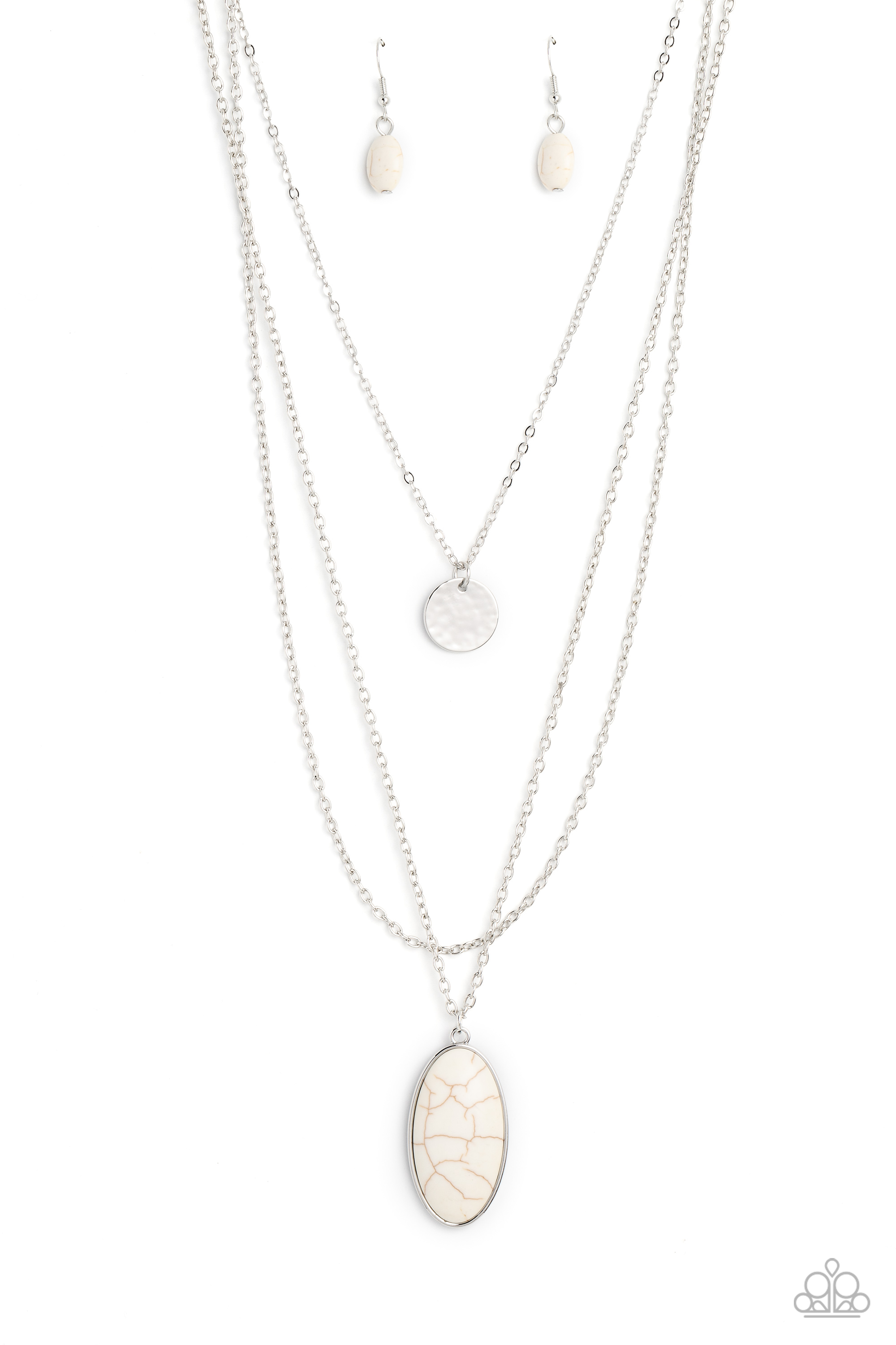 An elongated oval white stone, pressed into a silver frame, swings from the bottom of an elongated silver chain. Layers of silver chain and a hammered silver disc add charisma as they combine to fall below the collar for a timeless earthy finish. Features an adjustable clasp closure. As the stone elements in this piece are natural, some color variation is normal.