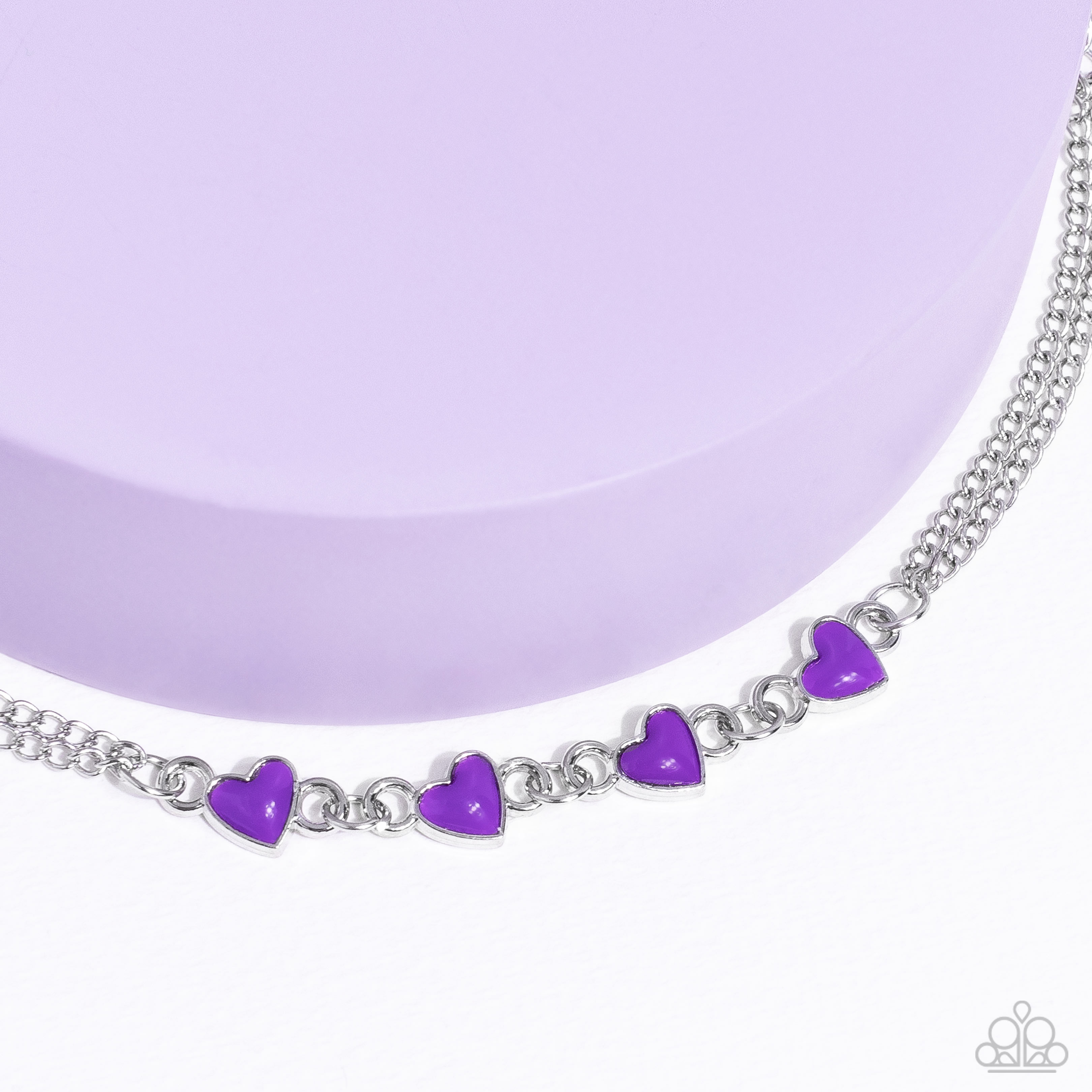 Nestled in dainty silver frames, a collection of vibrant purple heart-shaped pendants delicately links across the wrist on a double strand of silver chains for a dash of swoon-worthy color. Features an adjustable clasp closure.
