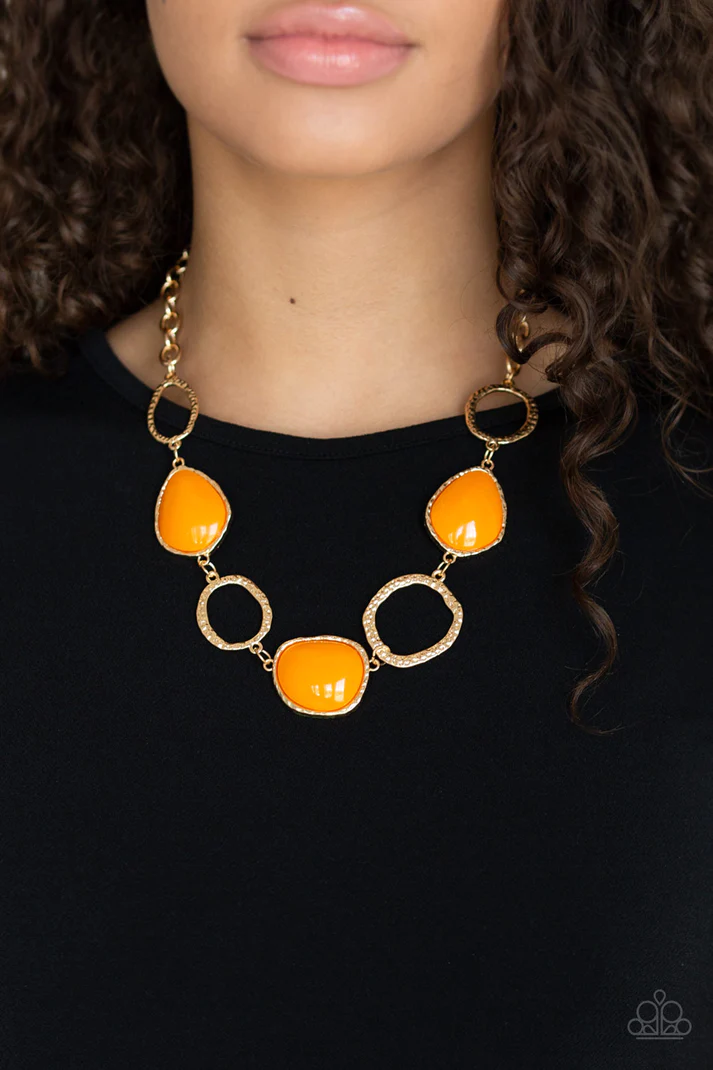 Delicately hammered in shimmery textures, asymmetrical gold rings and orange beaded frames link below the collar for a colorful look. Features an adjustable clasp closure.