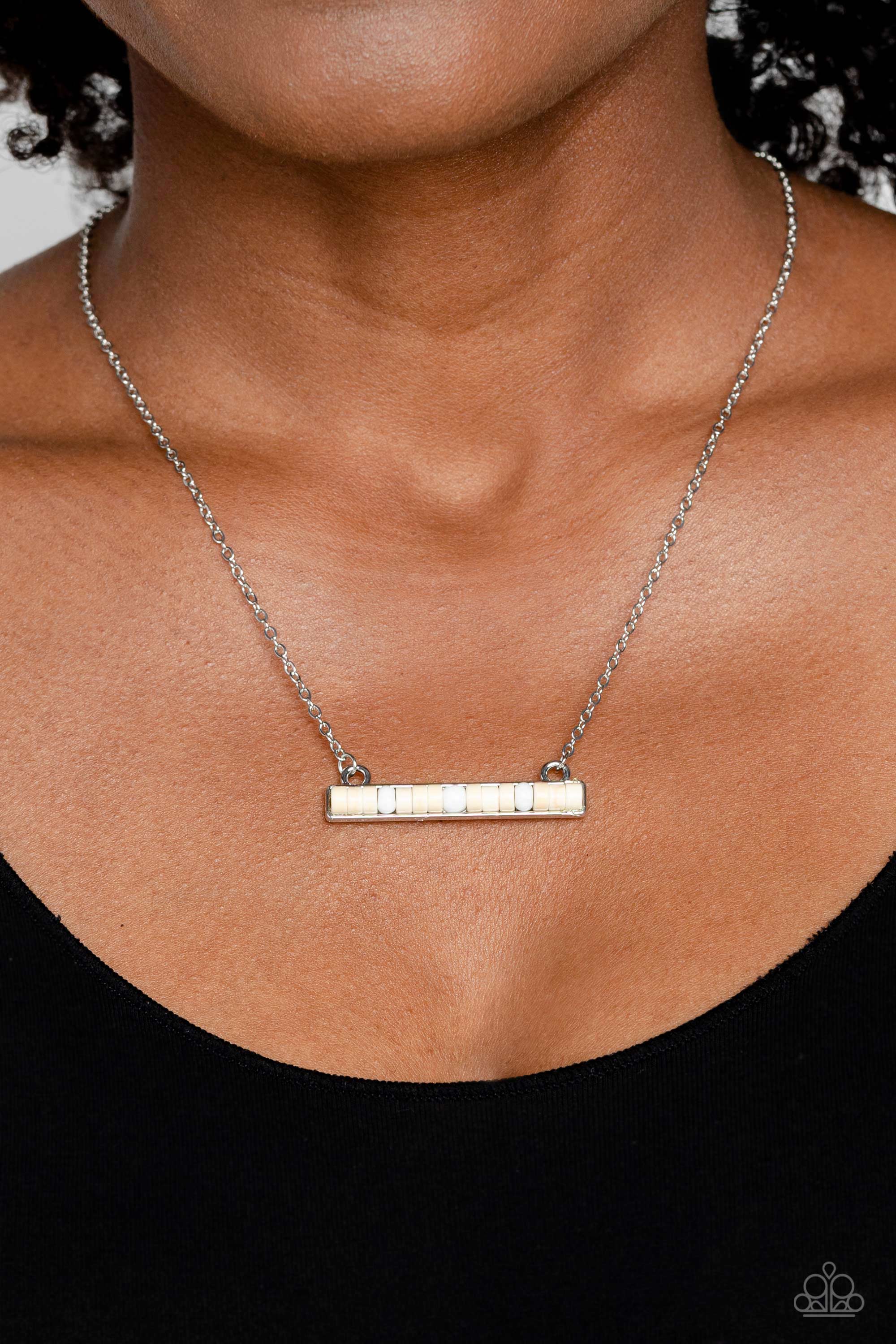 Cascading from a dainty silver chain, a collection of earthy white stone discs and beads are set in a square silver bar setting, creating an understated, harmonious display. Features an adjustable clasp closure. As the stone elements in this piece are natural, some color variation is normal.