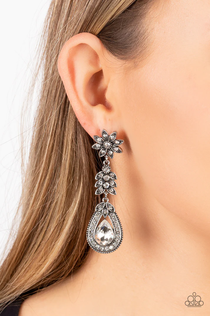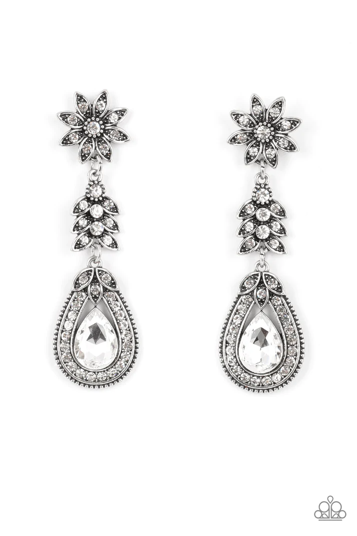 Dotted in dainty white rhinestones, a studded silver flower gives way to a leafy frame that is delicately suspended above a decorative white rhinestone dotted teardrop frame. An oversized teardrop gem seemingly floats inside the center of the lowermost frame, adding timeless dazzle to the floral fairytale. Earring attaches to a standard post fitting.