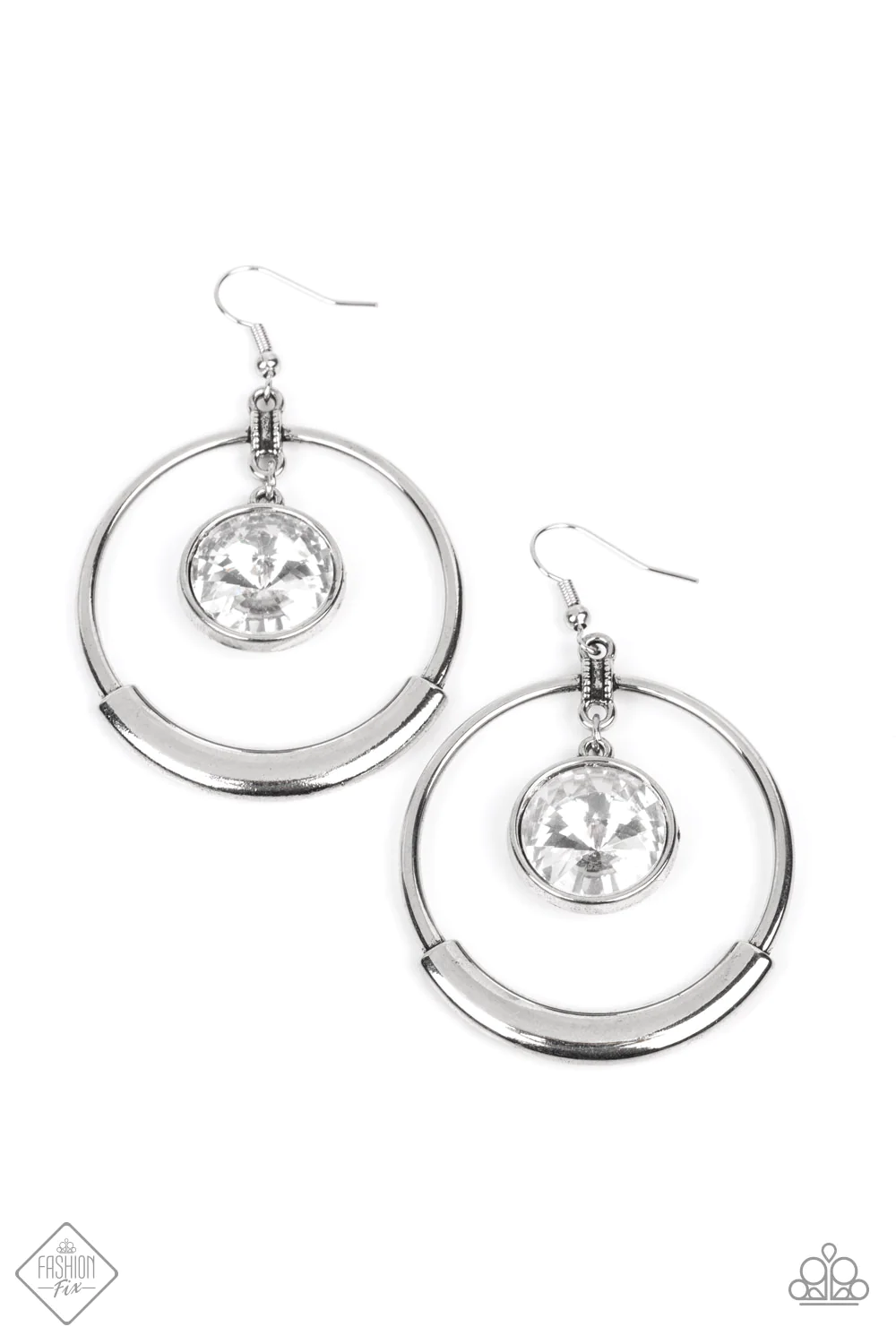 An oversized white gem glimmers brilliantly as it swings from the top of a sleek silver hoop. A thick curved bar of silver lays along the bottom of the airy hoop, emphasizing the bold design. Earring attaches to a standard fishhook fitting.
