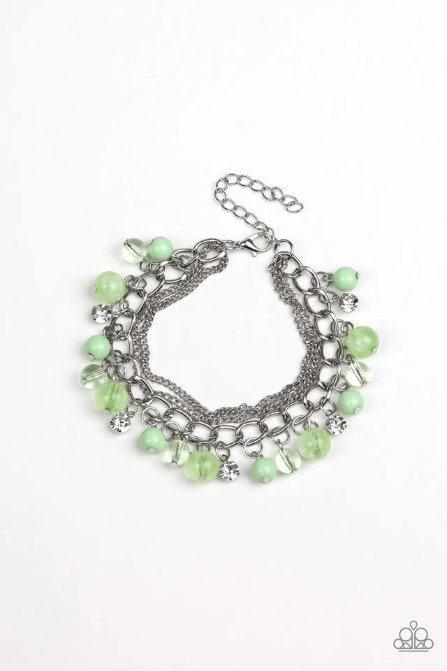 Infused with layers of mismatched silver chains, glassy, polished green, and glittery white rhinestones swing from the wrist in a whimsical fashion. Features an adjustable clasp closure. Sold as one individual bracelet.