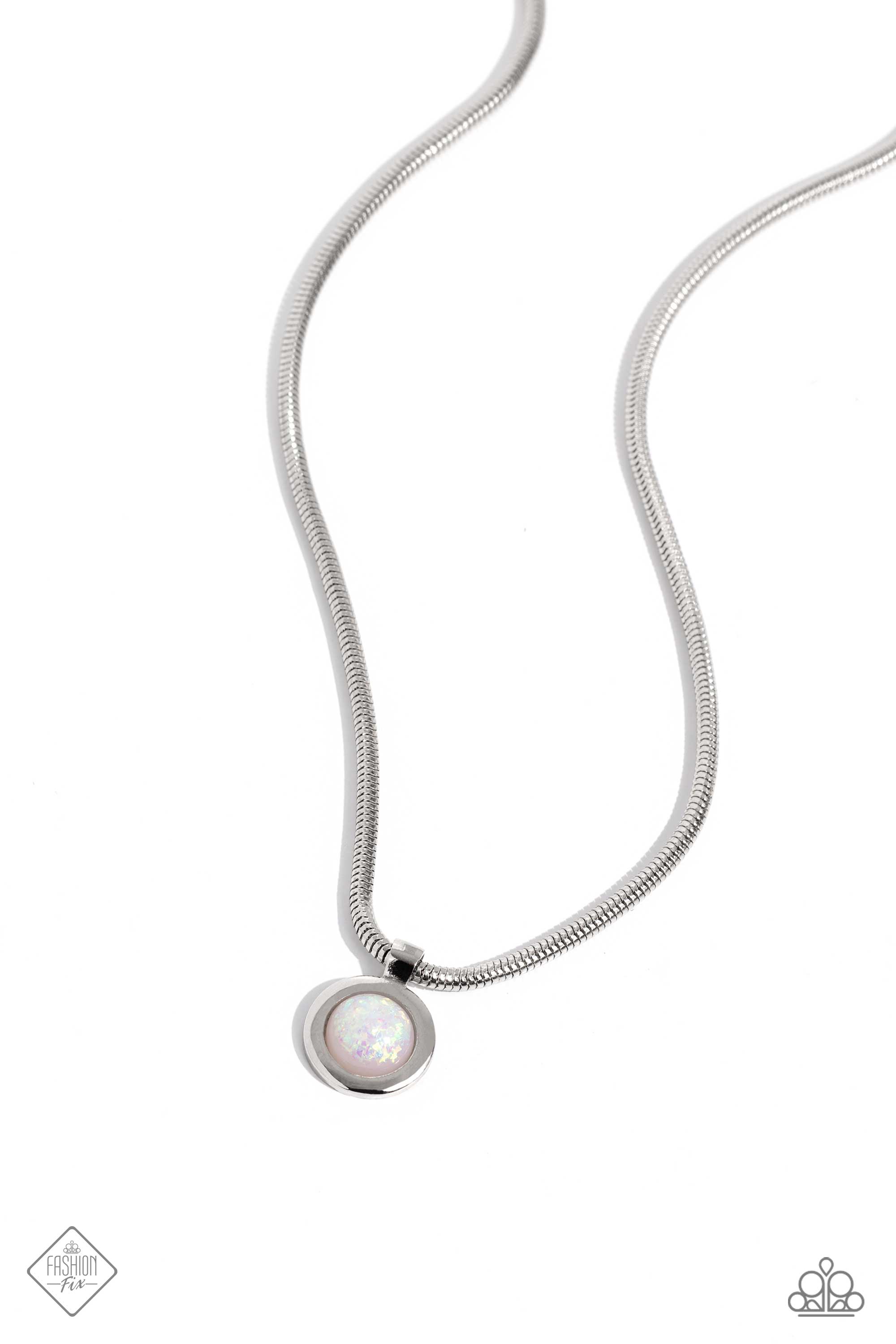 A shimmery white bead, infused with flecks of iridescence and wrapped in a thick silver frame, slides effortlessly along a thick silver snake chain, creating an irresistible pendant. Features an adjustable clasp closure. Due to its prismatic palette, color may vary.