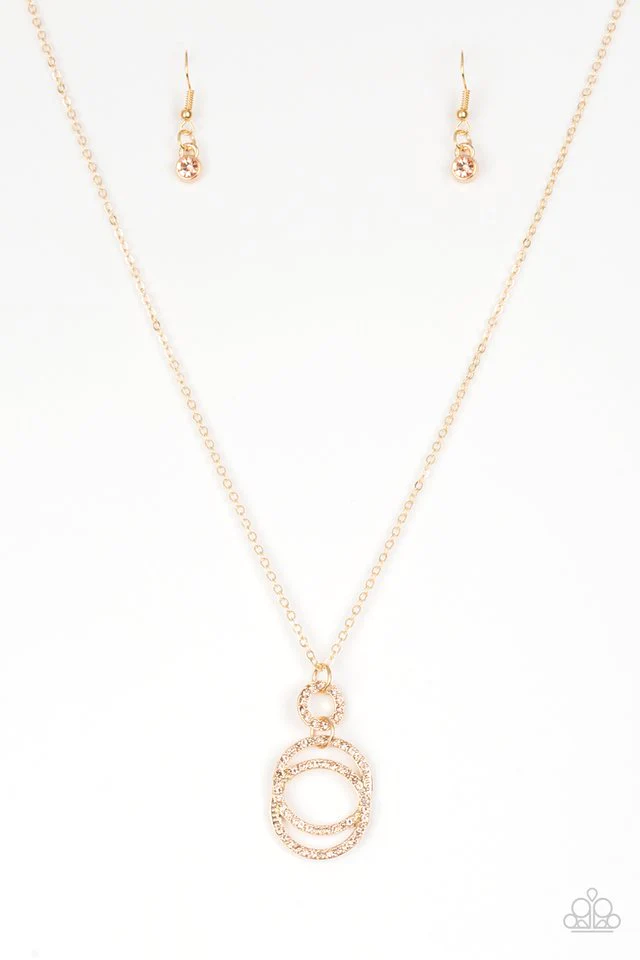 Encrusted in radiant peach rhinestones, three gold hoops interlock at the bottom of an elongated gold chain for an elegant look. Features an adjustable clasp closure. Sold as one individual necklace. Includes one pair of matching earrings.