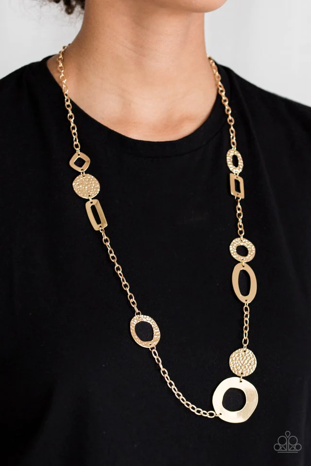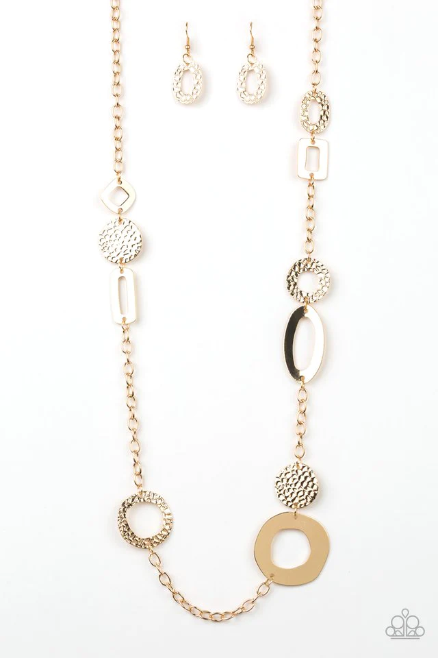 A collection of mismatched smooth and textured gold frames connect into an abstract chain across the chest. Features an adjustable clasp closure. Sold as one individual necklace. Includes one pair of matching earrings.