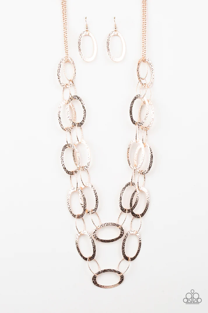 Delicately hammered in shimmery textures, two rows of glistening rose gold hoops layer down the chest for a sleek look. Features an adjustable clasp closure.