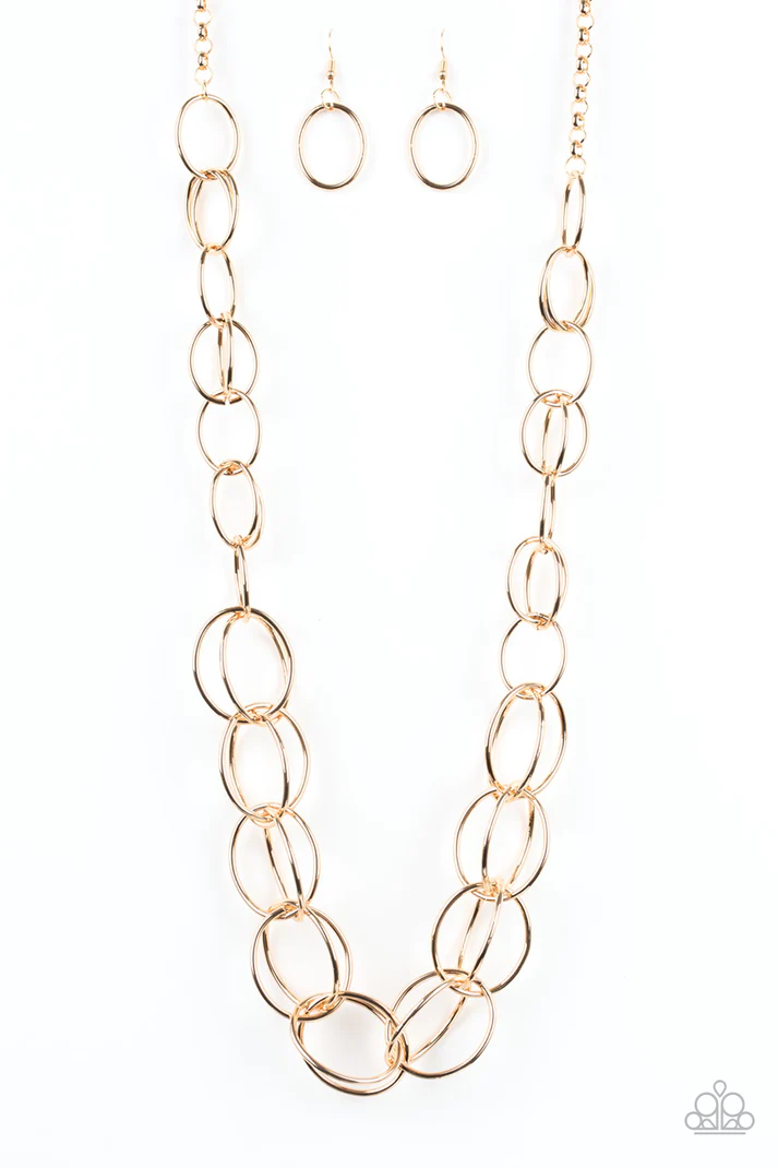 Gradually increasing in size, a collection of bold gold hoops link to a dramatically interconnected chain for a statement-making look. Features an adjustable clasp closure.