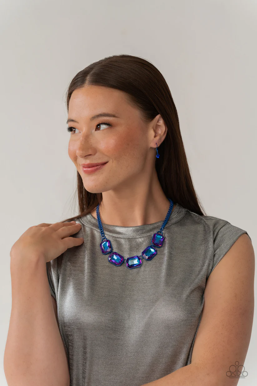 Featuring a vivacious blue chain, a collection of purple UV shimmery emerald-cut gems, pressed in vibrant blue frames, coalesces around the collar to create a playful pop of edgy color. Features an adjustable clasp closure.